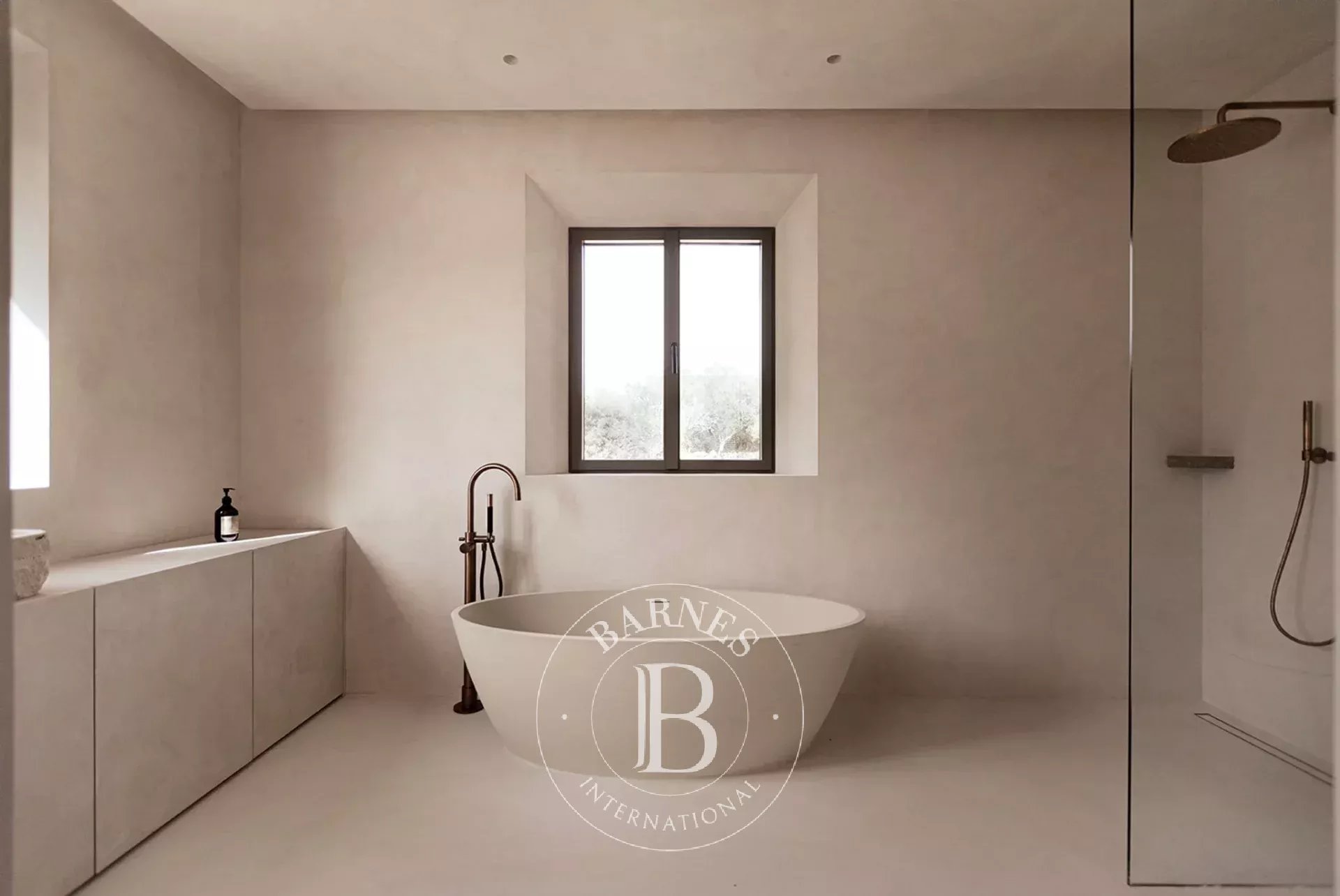 Die Gestaltung betont klare Linien, natürliche Materialien und eine beruhigende Farbpalette. Steinmauern, Holzakzente und große Glastüren schaffen einen harmonischen Übergang zwischen Innen- und Außenbereichen. Mediterrane Gärten, der Poolbereich und sonnige Terrassen bieten Privatsphäre und herrliche Ausblicke, ideal zum Entspannen und Unterhalten.