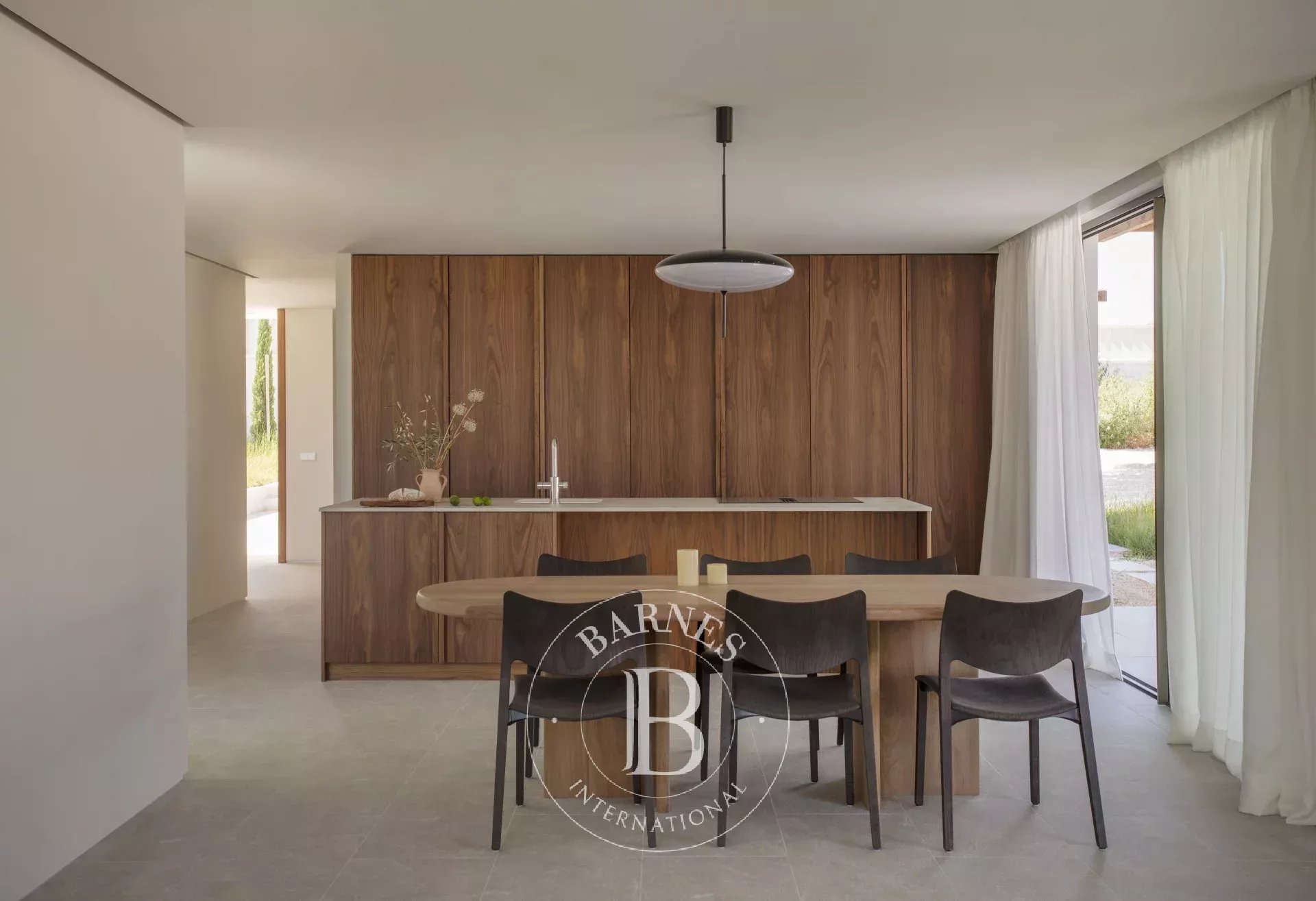 Le rez-de-chaussee presente un plan ouvert elegant ou une cuisine equipee d appareils Miele se fond sans effort avec la salle a manger et le salon. De grandes fenetres encadrent la vue sur le jardin et la piscine privee, creant une connexion fluide entre les espaces interieurs et exterieurs. Le sol en carrelage en porcelaine renforce l esthetique moderne de la villa, tandis que la terrasse de 121 metres carres prolonge l espace de vie a l air libre. Une des quatre chambres, completee par une salle de bain attenante et un acces direct a la terrasse, se trouve a ce niveau, offrant commodite pour les invites ou les membres de la famille.
